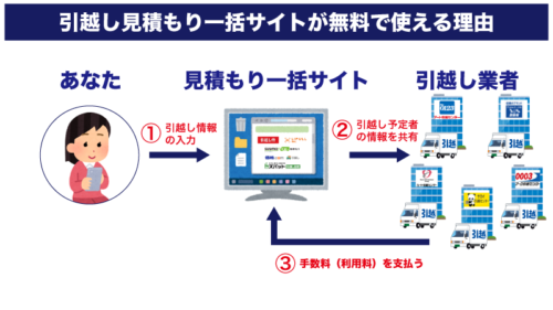 では一括見積もりサイトはどこで利益を得ているかというと、引越し会社等からの利用料(紹介手数料)です。